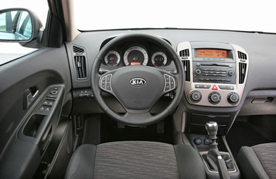 Nüchternes Ambiente Was außen so vielversprechend antörnt, relativiert sich innen. Da fehlt das gewisse Extra, etwas mehr Pep und ein moderneres Ambiente hätte die Sache rund gemacht. So geht es in die Richtung, die so ziemlich alle Hersteller bieten: Eine gefällige Mittelkonsole mit ordentlich angeordneten Schaltern, eine übersichtliche Instrumentierung und einige Ablagemöglichkeiten. Hervorzuheben sind allenfalls die Ausstattungsmerkmale, die bei anderen Klassenkameraden oftmals fehlen. So hat der cee´d serienmäßig in der Grundausstattung ein Multifunktions-Display mit sieben nützlichen Funktionen, eine Radio-Bedientastatur am höhen- und tiefenverstellbaren Lenkrad, elektrische Fensterheber vorne und Spiegel, die sich elektrisch einstellen und beheizen lassen. Auch dabei ist eine Zentralverriegelung mit Funk-Fernbedienung und eine Laderaumabdeckung für das Transportabteil. Also hier darf nicht gemeckert werden, denn alles ist im Preis inbegriffen, der bei interessanten 15.900 Euro in der LX-Ausstattung beginnt.
