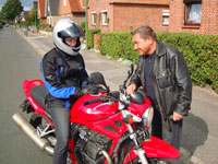 Plötzlich die Stimme meines Fahrlehrers Manfred Plewinski von der Fahrschule Wenskus aus Lübeck: „Was habe ich zu dir gesagt? Erst blinken, dann schauen und wenn alles frei ist, losfahren. Anhalten und noch mal von vorn.“ Mist, doch alles falsch gemacht – und ich bin wieder auf den Boden der Tatsachen zurück gekommen. Aber kein Meister ist bisher vom Himmel gefallen und ein Führerschein der Klasse A wird einem nicht geschenkt, denn damit kann man ab einem Alter von 25 Jahren alle Motorräder fahren. Also, Zähne zusammenbeißen und es besser machen. Mit leicht zitternden Knien geht es los zur zweiten Runde. Gemächlich fährt mein Fahrlehrer vor mir im Auto und dirigiert mich über die Helmanlage sicher und souverän bis zum Volksfestplatz in Lübeck. Eh ich mich versah, standen schon etliche Pylonen hintereinander aufgereiht vor meiner Fahrschulmaschine, einer Suzuki Bandit. „Das hier ist ein Slalom-Parcours, den du mit 30 Stundenkilometer durchfahren wirst. Danach wendest du am Ende der Straße und kommst mit 50 km/h angefahren, um direkt neben mir eine Vollbremsung zu machen. Bitte denke daran, die Fuß- und Handbremse gleichmäßig stark zu betätigen, denn das Motorrad hat ABS. Nach erneutem Wenden durchfährst du den Slalom im Schritttempo. Bei dieser Disziplin ist es wichtig, das man nur mit der Kupplung und mit leichter Betätigung der Fußbremse durchrollt. Und danach üben wir noch Kurven fahren, in dem du drei Runden links und drei Runden rechts herum im Kreis fährst. Glaub mir, das ist total einfach, es wird dir richtig Spaß machen“, sprach Manfred und schickte mich los. Als erstes ging es in den Parcours. Donnerwetter, das ging ja richtig gut. Auf zur nächsten Übung, die Vollbremsung. Gesagt, getan, auch das war nicht von schlechten Eltern. Hoch motiviert ging es zum Slalom im Schritttempo. Super und was kam jetzt dran? Richtig, Kreis fahren. Nachdem ich alles mit Bravour gemeistert hatte, wartete ich gespannt auf das Lob meines Fahrlehrers. Und im Großen und Ganzen war er auch sehr zufrieden. In den folgenden Fahrstunden fuhr Manfred mit seinem Auto hinter mir her und gab nur kurze Anweisungen, in welche Richtung ich zu fahren hatte. Nach insgesamt 25 Fahrstunden auf dem Motorrad und zehn theoretischen Stunden in der Fahrschule durfte ich die Prüfung absolvieren. Zuerst die Schriftliche und nach erfolgreichem Abschneiden (weniger als 10 Punkte), die Praktische. Bei den fahrtechnischen Grundaufgaben während der Prüfung wird ziemlich das Gleiche gemacht, wie bei den Übungen zuvor mit dem Fahrlehrer. Im Anschluss folgt noch eine Stadt-, Land- und Autobahnfahrt. Dabei muss man besonders auf folgende Dinge achten: Beim Anfahren blinken, schauen, rechts vor links beachten, Geschwindigkeiten einhalten, bei abknickender Vorfahrtsstraße blinken und auf keinem Fall den Schulterblick vor dem Abbiegen vergessen. Ich war überglücklich als der Prüfer mir zur bestandenen Fahrprüfung gratulierte. In weniger als vier Wochen hatte ich den Führerschein gemacht und alles zusammen hat rund 1500 Euro gekostet. Manfred Plewinski (rechts) von der Fahrschule Wenskus zeigt Bettina Buck die Funktionen der Fahrschulmaschine, einer Suzuki Bandit 650, 72 PS, Baujahr 2007. Welche Motorrad-Führerscheine kann man erwerben (mit welchen Alten darf man welche Motorräder fahren und was kosten sie an Grundgebühren plus Fahrstunden): Mofa bis 25 km/h (ab 15 Jahre, 160 Euro, beinhaltet sechs Theorie- und zwei Fahrstunden) Klasse M, Kleinkraftrad bis 45 km/h, (ab 16 Jahre, 170 Euro, plus Fahrstunden a’ 35 Euro) Klasse A1, Kraftrad bis 125 cm³ Hubraum und 11 kW (ab 16 Jahre, 230 Euro, plus 12 Pflichtstunden a’ 41 Euro sowie Fahrstunden a’ 35 Euro) Klasse A beschränkt bis 25 kW (ab 18 Jahre, 230 Euro, plus 12 Pflichtstunden a’ 45 Euro sowie Fahrstunden a’ 38 Euro) nach zwei Jahren bekommt man: Klasse A unbeschränkt (früher Klasse 1, ab 25 Jahre sofort unbeschränkt, 230 Euro, plus 12 Pflichtstunden a’ 45 Euro sowie Fahrstunden a’ 38 Euro) Fahrschul-Gebühren praktisch 112,81 Euro TÜV 11,07 Euro Führerschein-Amt bei Erweiterung 42,60 € Helm 120 Euro Handschuhe 30 Euro Nierengurt 20 Euro Stiefel 250 Euro wetterfeste Jacke und Hose mit Protektoren 300 Euro